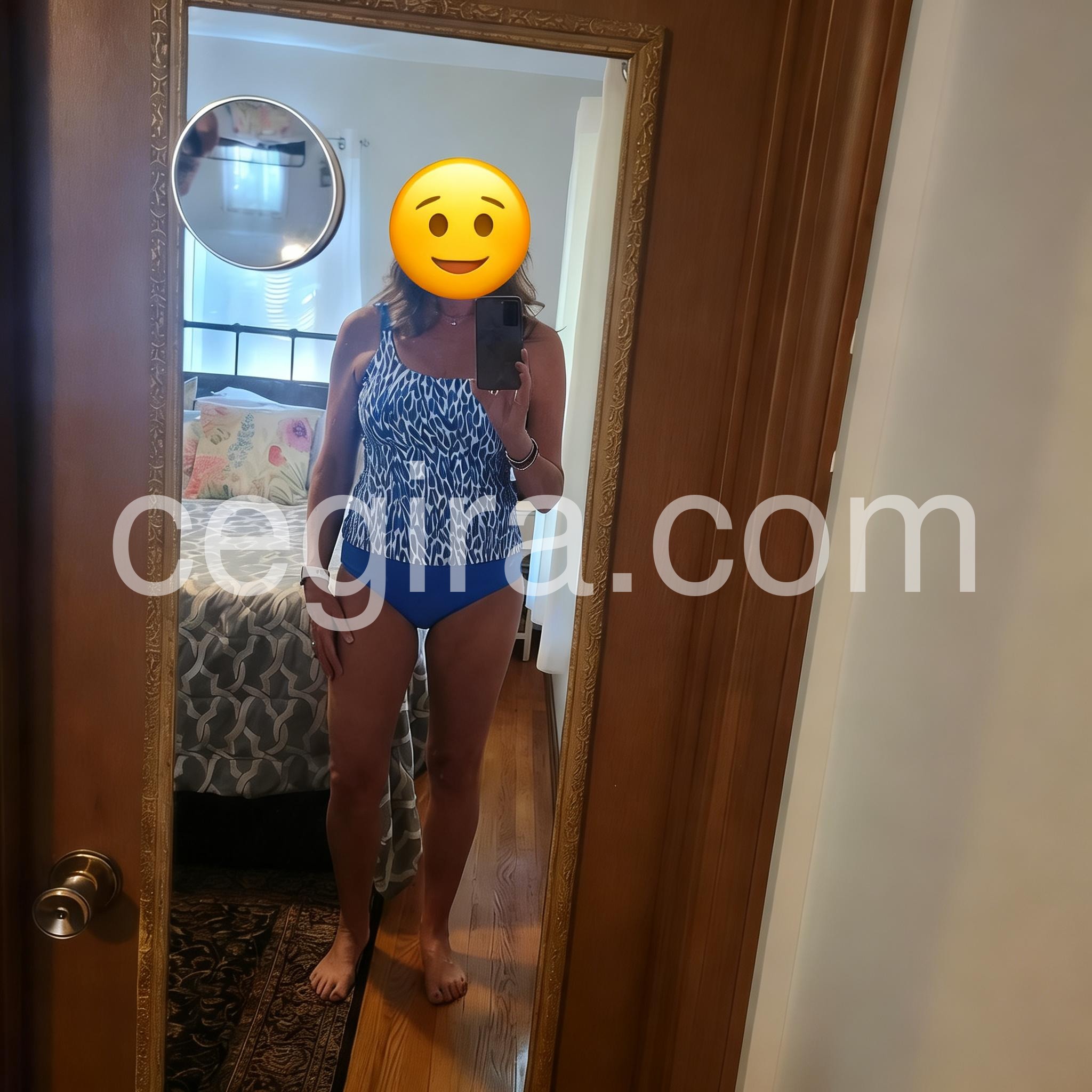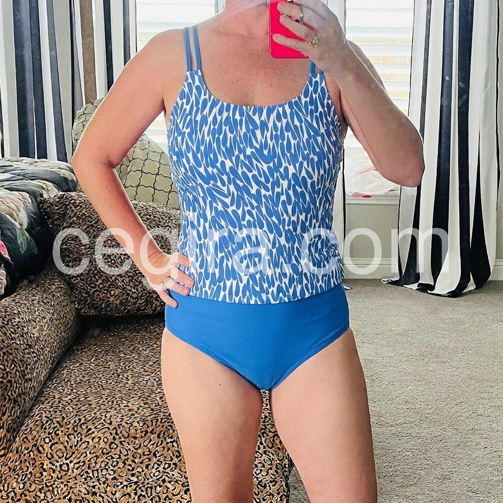 I am very happy with the fit of this two piece suit. The material is durable. Functions well in the water. No worries about the top flipping up. Light weight with comfortable stretchiness. I’ve had compliments.
