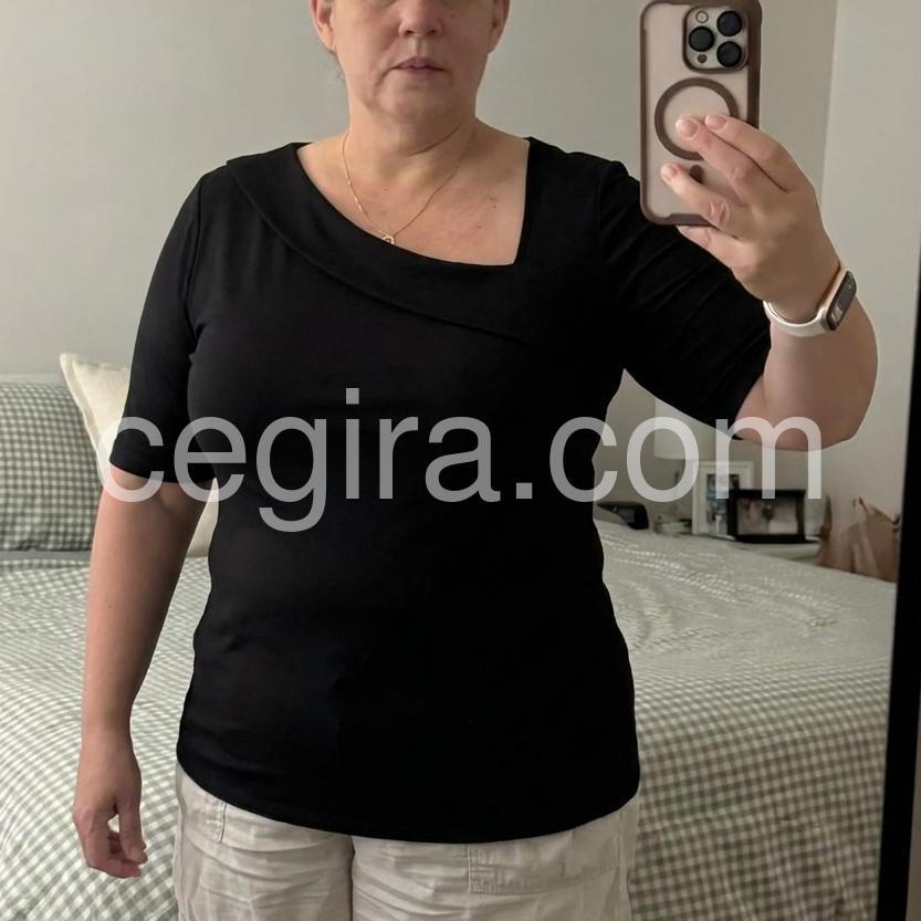 It's a simple shirt but the design and cut is so so flattering. I'm purchasing several more. Washed it 3 times and so far the black is still as full and rich as when I first put it on. Def a must have wardrobe staple!