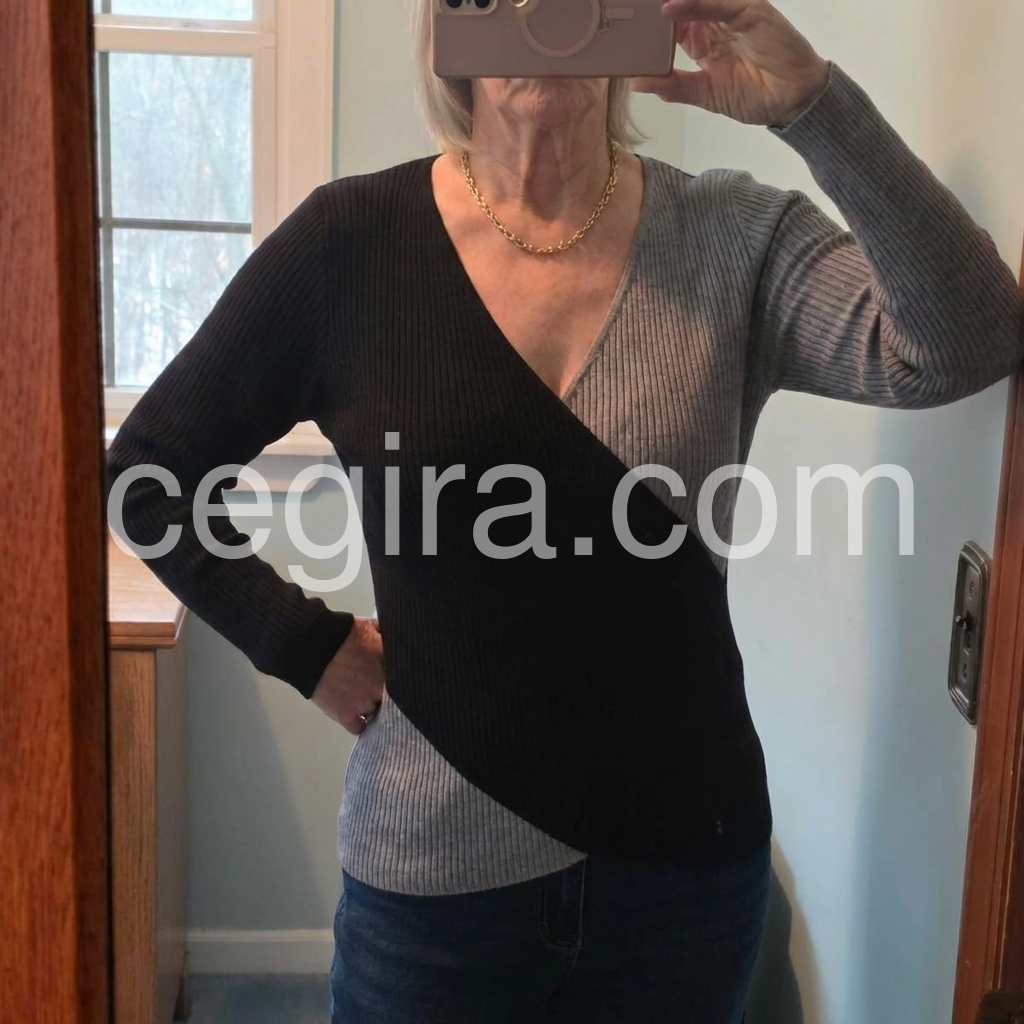 The sweater looks exactly like the picture. The length was what is shown. The fabric is easy care, light weight and easily layerable if needed. Great for winter with long sleeves but light weight for fall or spring. The neck line is flattering.