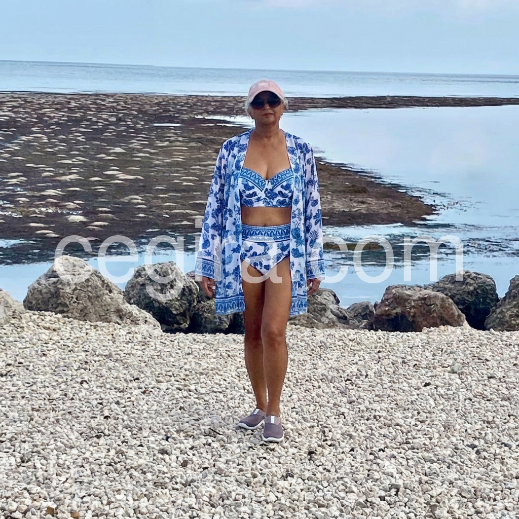 I was a little worried about fit, but this swimsuit surprised me. The sizing feels true, and the top stays in place comfortably when I walk. The pattern is eye-catching, and the color combination looks even better in real life. The cover-up also gives extra style, so I don’t need to bring another outer layer.