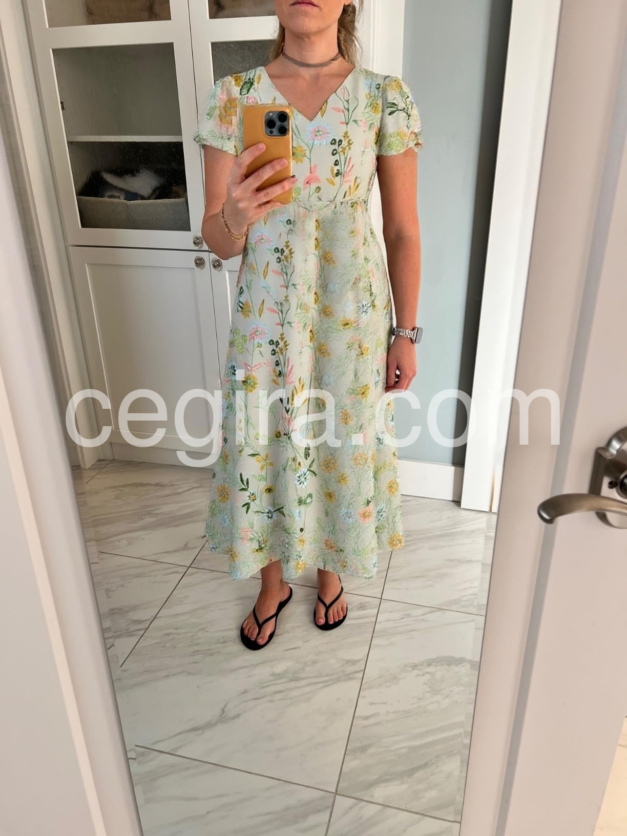 This Distinctive V-Neck Short Sleeve Maxi Dress features a unique v-neck design and short sleeves, giving it a timeless and elegant appearance. Its comfortable and flowy fit makes it perfect for any occasion, while its high-quality material ensures durability. Upgrade your wardrobe with this stylish and functional dress.