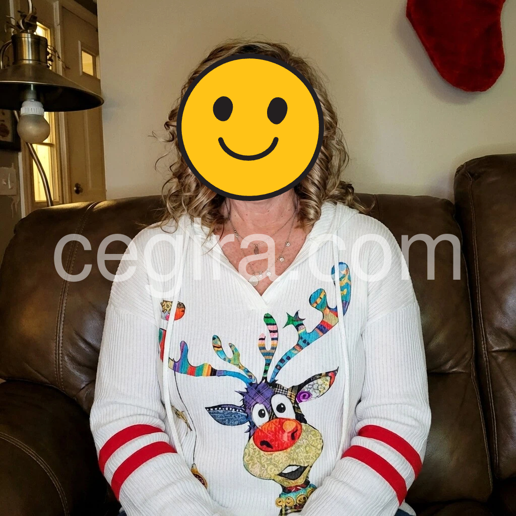 Bring in the winter season with this holiday-ready reindeer top. A white cozy ribbed top with red stripes and colorful reindeer print make this hoodie a cheerful complement to your day or night with its relaxed vibe.  A plunging v-neck and buttons on the front give it the perfect amount of detail and chic fit.